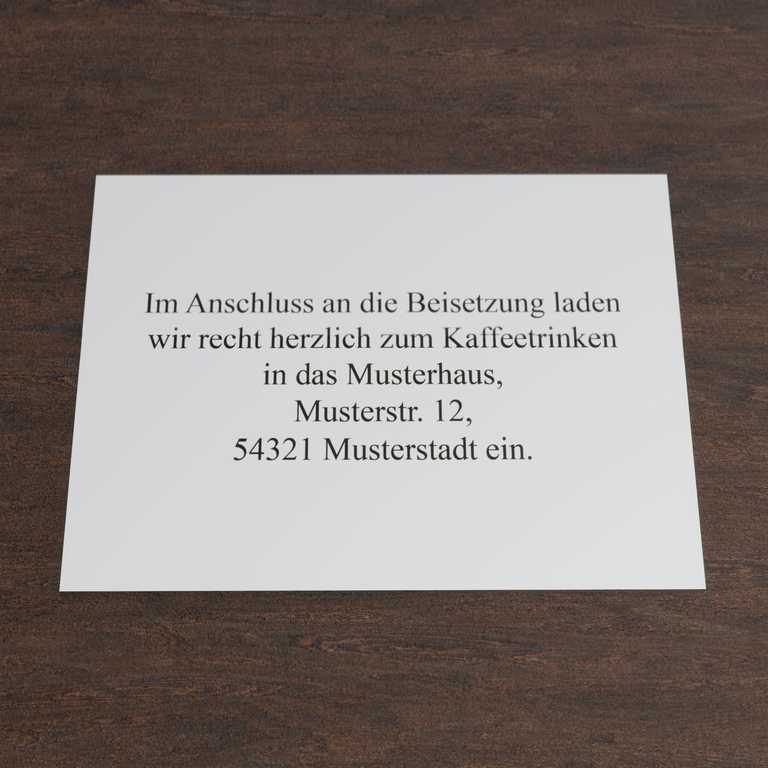 In der Regel werden Familienmitglieder und ausgewählte Trauergäste zum Leichenschmaus eingeladen. Es ist auch üblich, den Pfarrer oder Trauerredner zum Trauerkaffee einzuladen. Grundsätzlich sollten Sie Menschen einladen, die Sie nach der Beerdigung gerne um sich haben möchten. Dies können Personen sein, die dem Verstorbenen sehr nahestanden oder auch solche, die Ihnen ein tröstliches Gefühl geben. Die Einladung zum Trauerkaffee können Sie persönlich aussprechen oder schriftlich zur Trauerkarte beilegen.