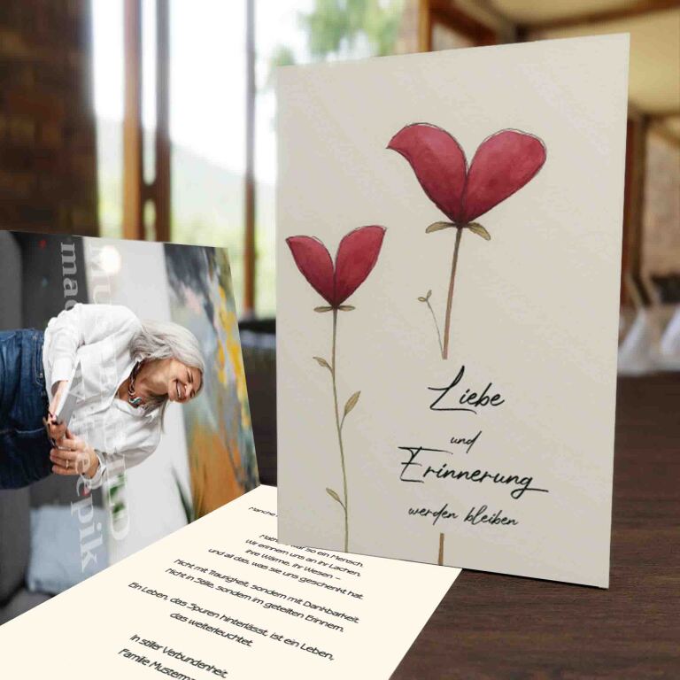 Die Lebensfeierkarte „Blüte“ zeigt zwei zarte Blumen, deren Blüten jeweils ein Herz andeuten.