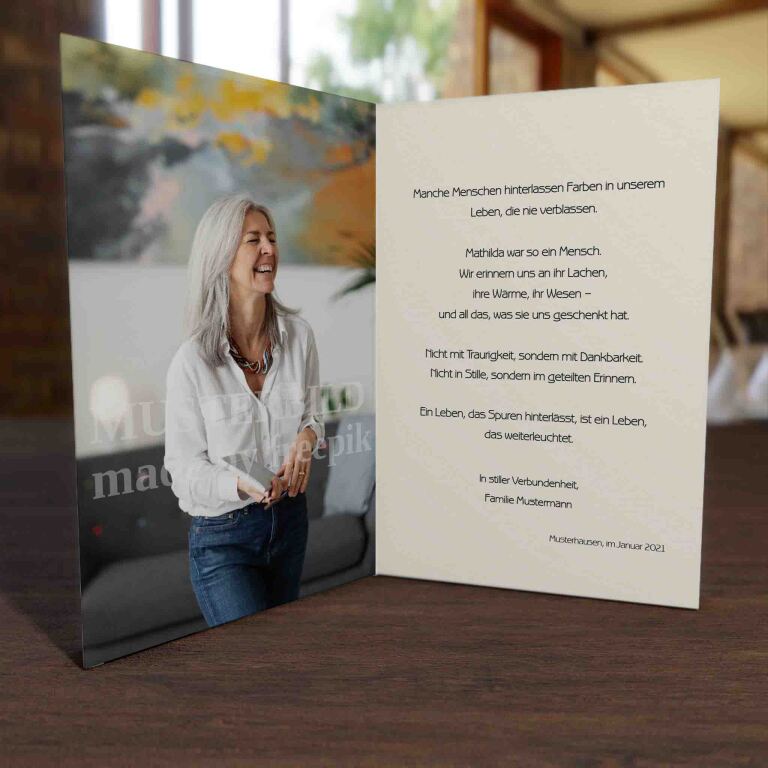 Diese Lebensfeierkarte ist 4-seitig und wird individuell für Sie in Farbe gedruckt.