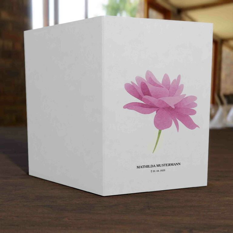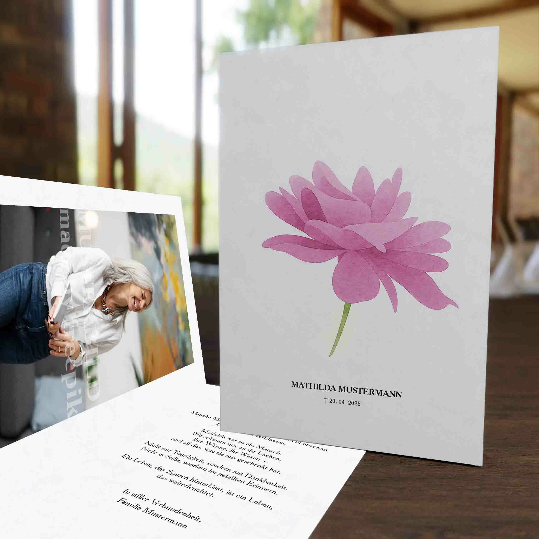 Die Lebensfeierkarte „Blume“ zeigt eine volle rosafarbene Blüte vor einem schlichten Hintergrund.