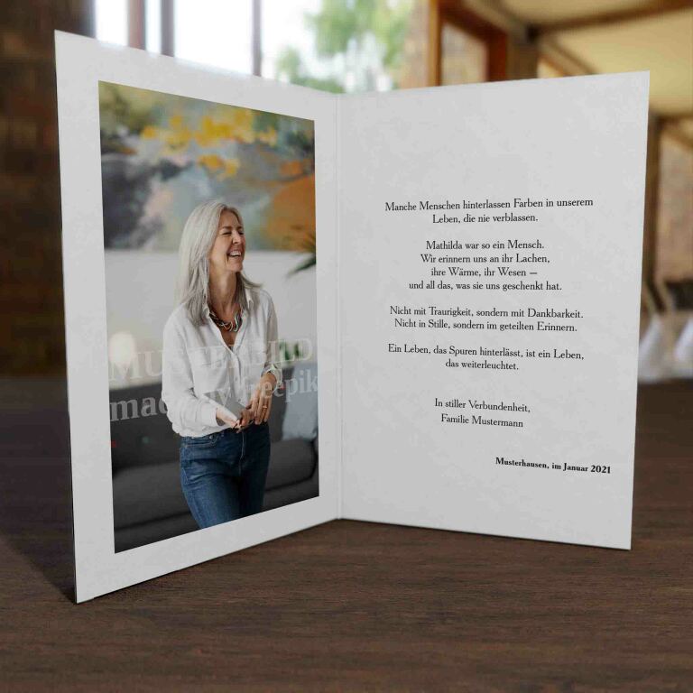 Diese Lebensfeierkarte ist 4-seitig und wird individuell für Sie in Farbe gedruckt.