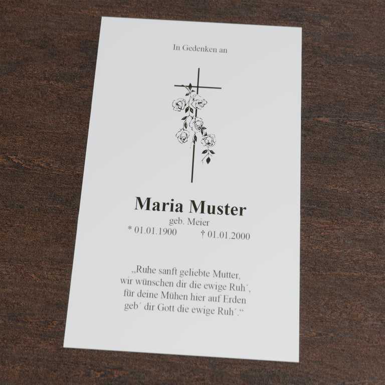 Unsere Sterbebilder werden auf hochwertigem, mattem Bilderdruckpapier (170g/m²) gefertigt und bieten eine angenehme Haptik.
