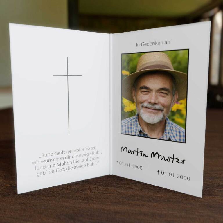 Unsere Sterbebilder werden auf hochwertigem, mattem Bilderdruckpapier (170g/m²) gefertigt und bieten eine angenehme Haptik.