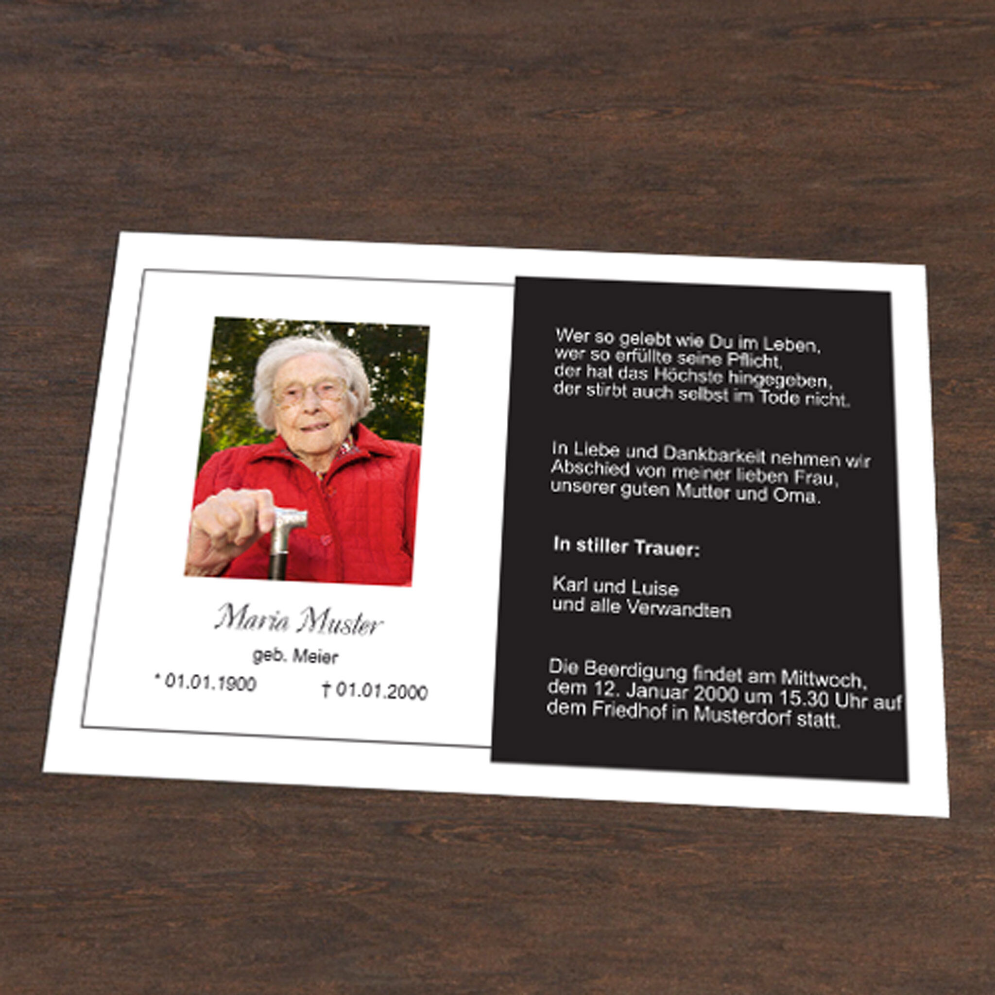 Stilvolle Trauerkarte mit dem Motiv Fotokarte im klassischen einseitigem Querformat. Informieren Sie nahestehende Verwandte und Freunde mit dieser Klappkarte „Fotokarte“ über den eingetretenen Trauerfall und den Termin für die Trauerfeier.