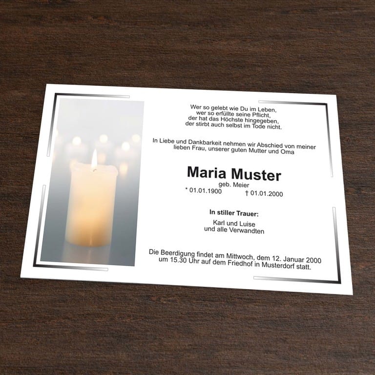 Stilvolle Trauerkarte mit dem Motiv Kerze im klassischen einseitigem Querformat. Informieren Sie nahestehende Verwandte und Freunde mit dieser Klappkarte „Kerze“ über den eingetretenen Trauerfall und den Termin für die Trauerfeier.